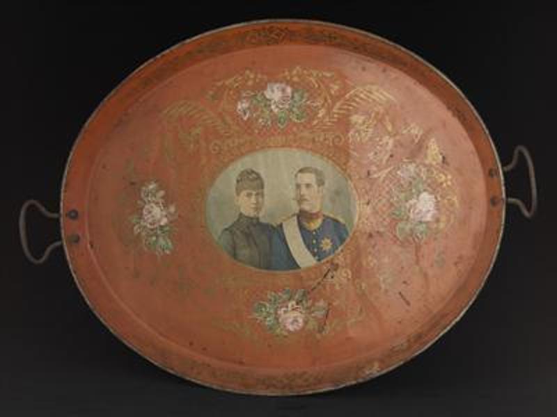 Τσίγκινος χρωματιστός ωοειδής δίσκος σερβιρίσματος με λαβές.