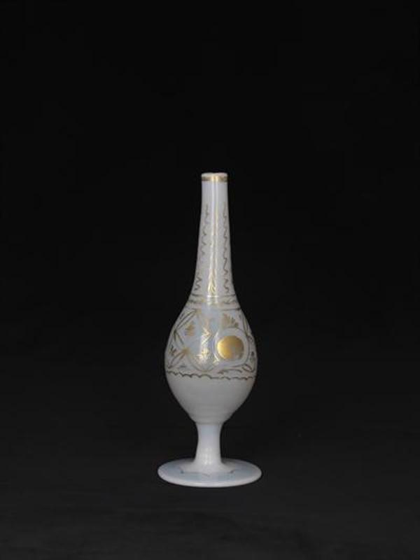 Γυάλινο λευκό ανθοδοχείο με επίχρυσο φυτικό διάκοσμο.