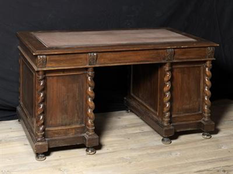 Ξύλινο γραφείο, χειροποίητο με δύο σειρές συρτάρια δεξιά και αριστέρά και ανάγλυφο διάκοσμο.