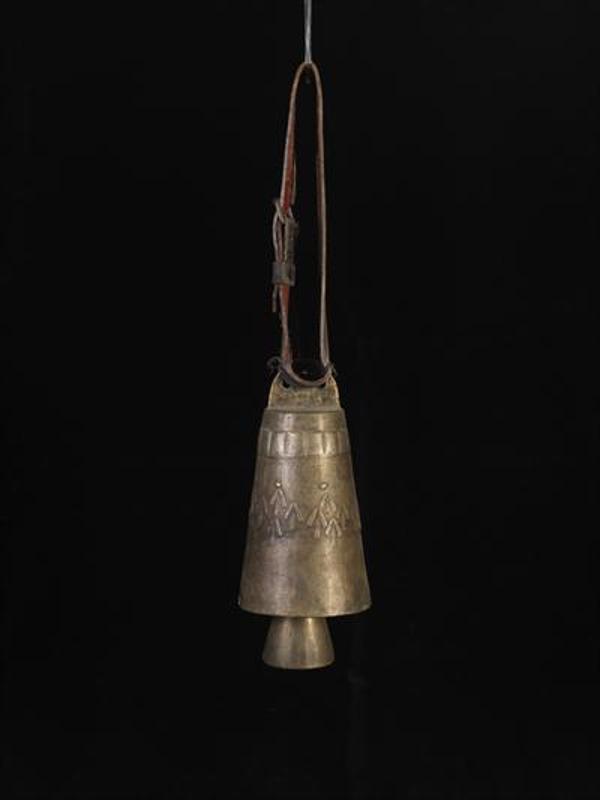 Ορειχάλκινο, χυτό, διπλό κουδούνι - κυπρί με δερμάτινο λουρί, για τράγους.