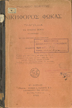 Το βιβλίο "Νικηφόρος Φωκάς" ανήκε στην κατηγορία «Ελεύθερα Αναγνώσματα» της δανειστικής βιβλιοθήκης του Διδασκαλείου Κρήτης στο Ηράκλειο. Πρόκειται για τραγωδία σε πέντε πράξεις, η οποία βραβεύτηκε στον Αβερώφειο Διαγωνισμό το 1913. Το βιβλίο αναφέρεται στη δραματική ζωή του στρατηγού Νικηφόρου Φωκά, ο οποίος μετά την ανάκτηση της Κρήτης από τους Σαρακηνούς γίνεται αυτοκράτορας του Βυζαντίου και εν τέλει δολοφονείται από τον ανιψιό του και μετέπειτα αυτοκράτορα Ιωάννη Τσιμισκή. Ο συγγραφέας Αριστομένης Προβελέγγιος (1850-1936) ήταν πολιτικός, ποιητής, θεατρικός συγγραφέας και μέλος της Ακαδημίας Αθηνών. Βραβεύτηκε με το «Εθνικόν Αριστείον Γραμμάτων και Τεχνών». Αν και άρχισε ως ποιητής της καθαρεύουσας, γρήγορα αποδέχθηκε τις θέσεις του δημοτικισμού και προέβλεψε την επικράτηση της δημοτικής γλώσσας.