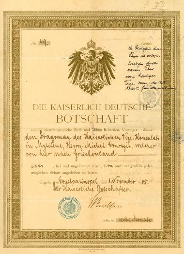 Έγγραφο ορισμού του Μίτσα Κουρτζή ως επίσημου δραγουμάνου (μεταφραστή) του Γερμανικού Υποπροξενείου Μυτιλήνης