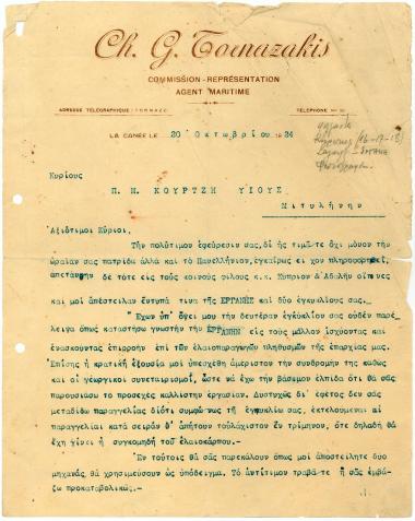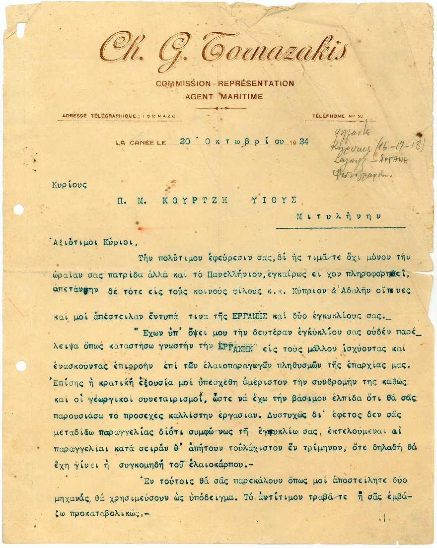 Εμπορική επιστολή για αποστολή της ελαιοκομικής μηχανής Εργάνης στα Χανιά