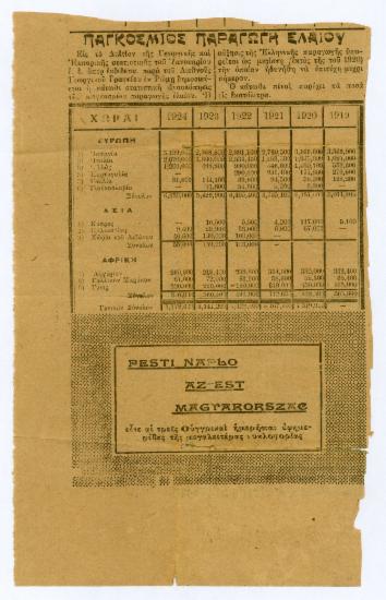Πρόκειται για αποκόμματα εφημερίδων, στα οποία γίνεται λόγος για τη παγκόσμια παραγωγή ελαιολάδου. Παρουσιάζονται στατιστικά στοιχεία προηγουμένων ετών και γίνεται η σύγκριση. Το 1924 καταγράφεται ως χρονιά υψηλής παραγωγής.