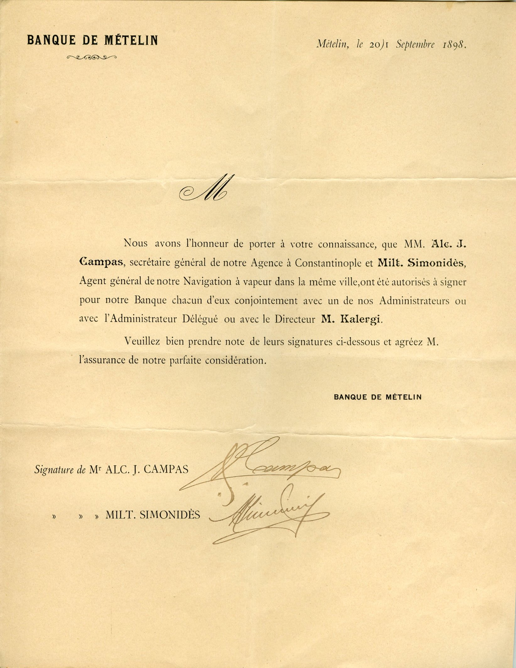 Έντυπη εγκύκλιος με εξουσιοδότη ση υπογραφή ς στους Καμπά και Σιμωνίδη στο υποκατάστημα Κων/πολης