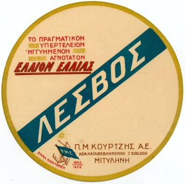Στρόγγυλη ετικέτα φιάλης ελαιολάδου Λέσβος