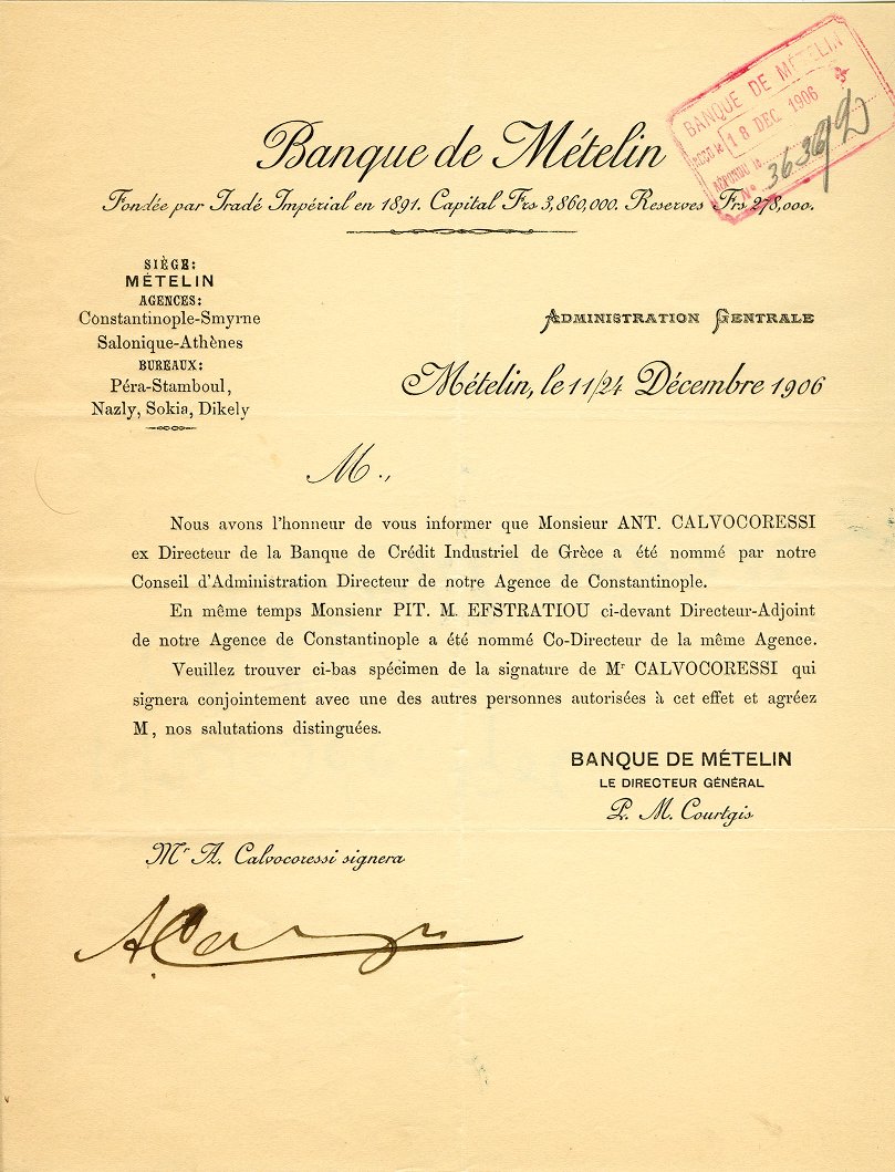 Εγκύκλιος σχετικά με το διορισμό του Αντ. Καλβοκορέσση στο υποκατάστημα Κων/πολης