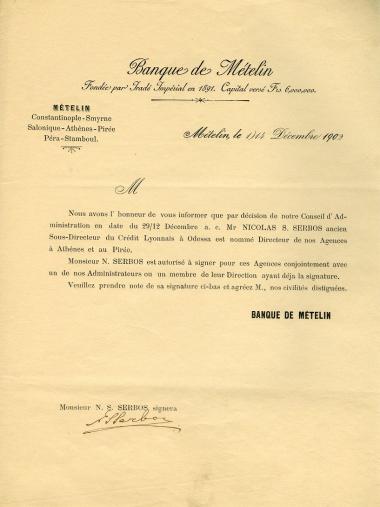 Εγκύκλιος σχετικά με το διορισμό Ν. Σ. Σέρμπου στη θέση διευθυντή υποκαταστήματος Αθήνας και Πειραιά