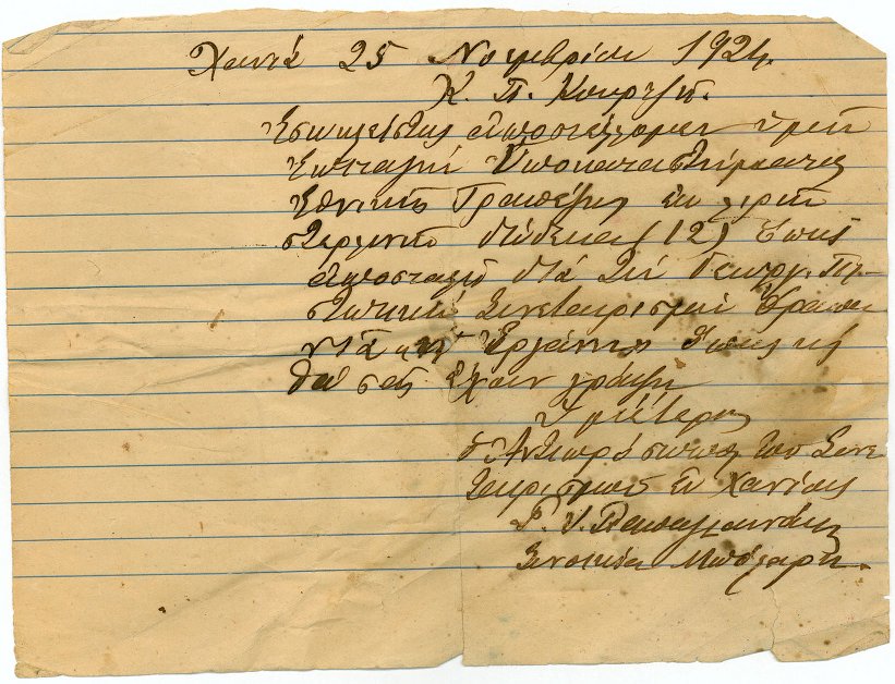 Επιστολή από την Κρήτη για την παραγγελία της μηχανής Εργάνη
