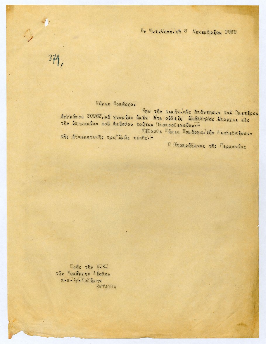 Επιστολή της Νομαρχίας Λέσβου προς το Γερμανικό Υποπροξενείο Μυτιλήνη ς