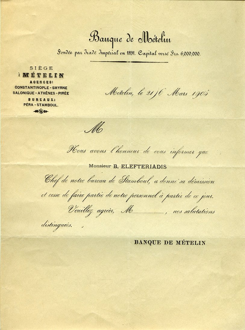 Εγκύκλιος σχετικά με την παραίτηση του Β. Ελευθεριάδη από τη θέση του διευθυντή του Υποκαταστήματος Κωνσταντινούπολης