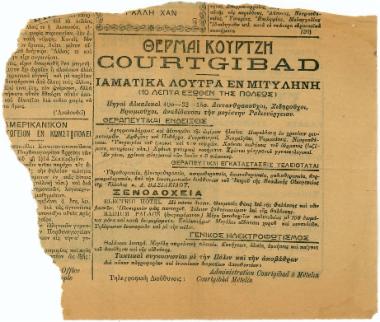 Πρόκειται για απόκομμα εφημερίδας της Κωνσταντινούπολης, στο οποίο υπάρχει διαφήμιση των ιαματικών λουτρών Θερμαί Κουρτζή. Τονίζονται τα ευεργετικά απότελέσματα της χρήσης των λουτρών στην υγεία και παρουσιάζονται οι πολυτελείς εγκαταστάσεις των λουτρών.