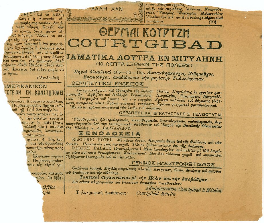 Απόκομμα εφημερίδας με διαφήμιση των Θερμών Κουρτζή