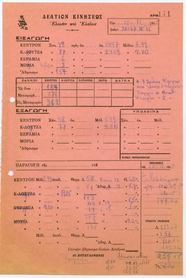Φάκελος με δελτία κιν ήσεως ελαιών και ελαίων της ΠΜ Κουρτζής ΑΕ