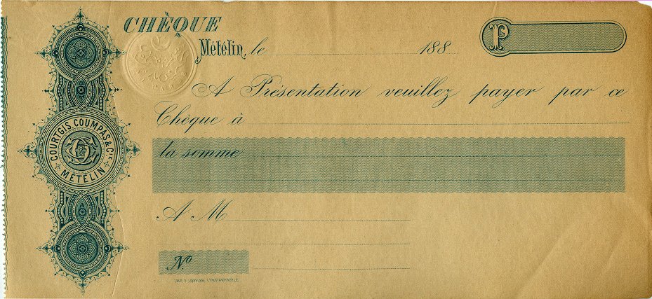 Έντυπη επιταγή της εταιρείας Courtgis, Coumpas & Cie Métélin