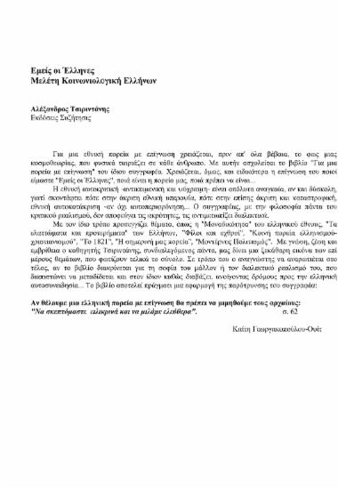 Η εθνική αυτοκριτική -αντικειμενική και ψύχραιμη- είναι απόλυτα αναγκαία, αν και δύσκολη, γιατί σκοντάφτει πότε στην άκριτη εθνική υπεροψία, πότε στην επίσης άκριτη και καταστροφική, εθνική αυτοκατάκριση -αν όχι αυτοπεριφρόνηση... Ο συγγραφέας, με την φιλοσοφία πάντα του κριτικού ρεαλισμού, δεν αποφεύγει τις ακρότητες, τις αντιμετωπίζει διαλεκτικά.