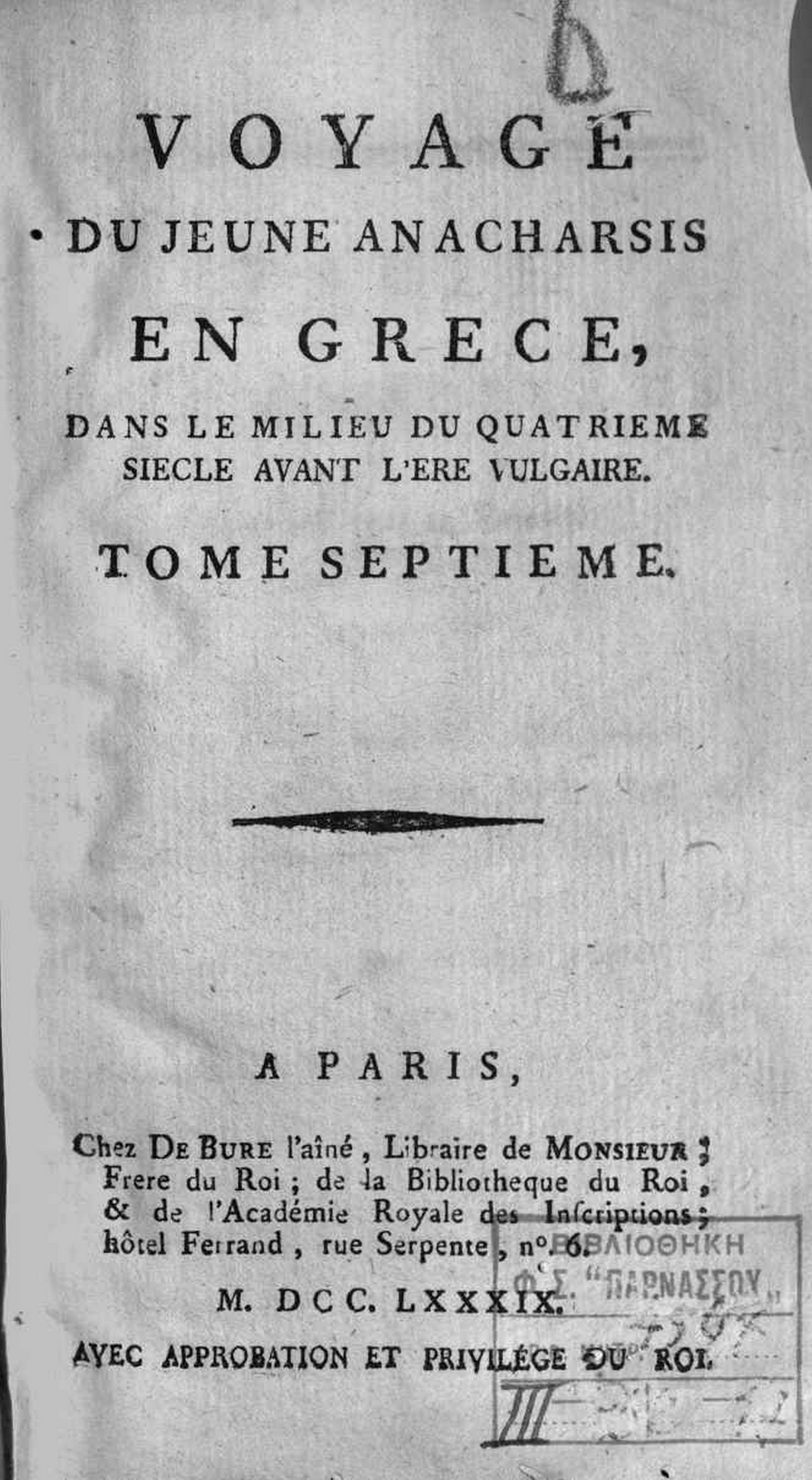 VOYAGE DU JEUNE ANACHARSIS EN GRECE, DANS LE MILIEU DU QUATRIEME SIECLE AVANT L’ERE VULGAIRE, TOME SEPTIEME
