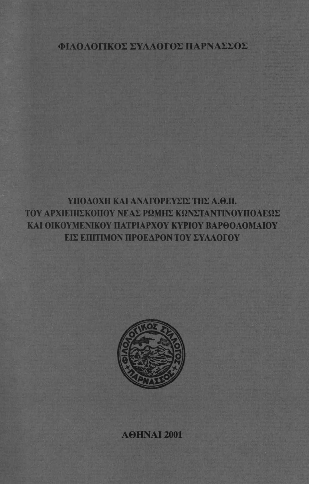 ΥΠΟΔΟΧΗ ΚΑΙ ΑΝΑΓΟΡΕΥΣΙΣ ΤΗΣ Α.Θ.Π. ΤΟΥ ΑΡΧΙΕΠΙΣΚΟΠΟΥ ΝΕΑΣ ΡΩΜΗΣ ΚΩΝΣΤΑΝΤΙΝΟΥΠΟΛΕΩΣ ΚΑΙ ΟΙΚΟΥΜΕΝΙΚΟΥ ΠΑΤΡΙΑΡΧΟΥ ΚΥΡΙΟΥ ΒΑΡΘΟΛΟΜΑΙΟΥ ΕΙΣ ΕΠΙΤΙΜΟΝ ΠΡΟΕΔΡΟΝ ΤΟΥ ΣΥΛΛΟΓΟΥ ΦΙΛΟΛΟΓΙΚΟΣ ΣΥΛΛΟΓΟΣ ΠΑΡΝΑΣΣΟΣ