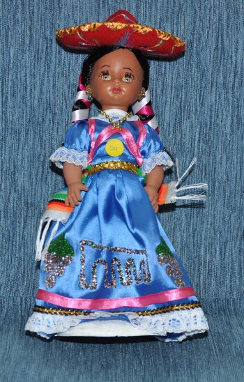 Η κούκλα φοράει μπλε φόρεμα με ανάγλυφα σχέδια και πολύχρωμα σιρίτια. Στη μέση της στηρίζεται πολύχρωμο ύφασμα. Στο κεφάλι φοράει κόκκινο βελούδινο καπέλο με πολύχρωμα σχέδια. Στα μαλλιά της είναι δεμένα με φουξ και άσπρες κορδέλες. Στηρίζεται σε άσπρη πλαστική βάση.