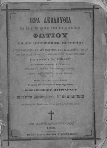 Εξεδόθη μεν το πρώτον κατά το 1848 δαπάναις του αοιδίμου Οικουμενικού Πατριάρχου κυρού Ανθίμου του από Εφέσου ήδη δε το δεύτερον δαπάναις του νυν ευκλεώς πατριαρχεύοντος Οικομενικού Πατριάρχου κυρίου κυρίου Διονυσίου Ε' του από Αδριανουπόλεως και διανέμεται δωρεάν ταις αγίαις του Χριστού Εκκλησίαις