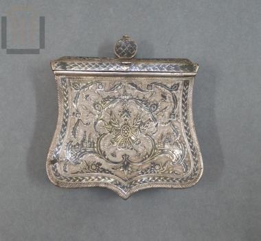 Παλάσκα. Φυσιγγιοθήκη οπλαρχηγών με χυτή τεχνική και σαβάτι. Διακοσμητικά θέματα: Στην μπροστινή όψη κεντρικό μετάλλιο με λάβαρα που πλαισιώνεται από κλάδο ανθοφόρο σε σημεία του οποίου αναπτύσσονται τρεις συνθέσεις με οικοδομήματα. Η όλη παράσταση πλαισιώνεται με φολιδωτό κόσμημα. Στην πίσω όψη υπάρχει επίθετη λαβή από την οποία περνούσε δερμάτινη ταινία για στερέωμα της παλάσκας στη μέση. Στις πλαϊνές όψεις υπάρχουν κλάδοι και ανθέμια σε γεωμετρική διάταξη. Στο κάλυμμα υπάρχουν κλάδοι και επίθετη κυκλική λαβή.