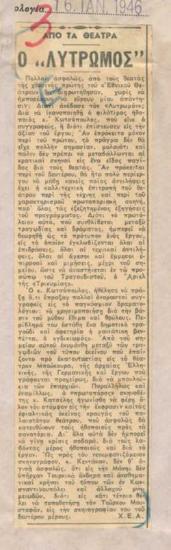 Ο "Λυτρωμός" του κ. Θ. Κωτσόπουλου, εις το Εθνικόν Θέατρον (Πρωτοποριακή Σκηνή)