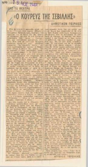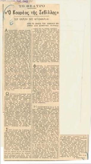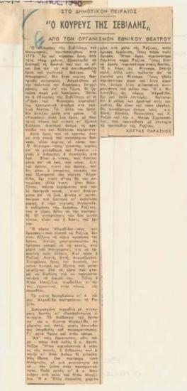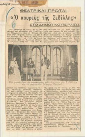 Εθνικόν Θέατρον, Δημοτικόν Πειραιώς. "Ο κουρεύς της Σεβίλλης" του Μπωμαρσαί