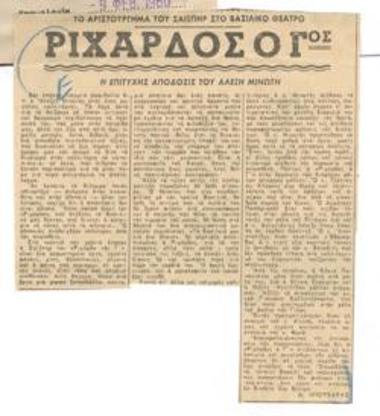 "Ριχάρδος ο Γος". Το αριστούργημα του Σαίξπηρ στο Βασιλικό Θέατρο. Η επιτυχής απόδοσις του Αλέξη Μινωτή