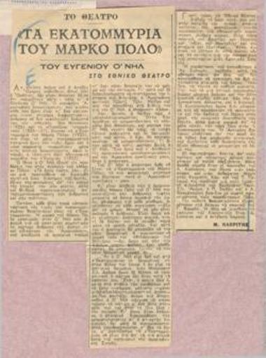 Δύο γαλλικές και πέντε ελληνικές παραστάσεις. Εθνικό Θέατρο, Ευγ. Ο' Νηλ "Τα εκατομμύρια του Μάρκο Πόλο", σε δύο μέρη και δώδεκα εικόνες