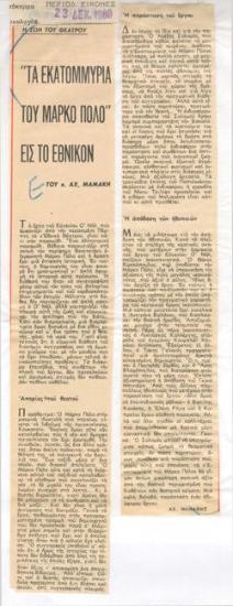 "Τα εκατομμύρια του Μάρκο Πόλο" εις το Εθνικόν
