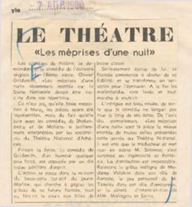 From the performances of the Athenian theatres. Oliver Goldsmith "The Mistakes of a Night" (Royal Theatre)