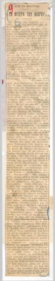 Από το Βασιλικό Θέατρο, Αλέξη Πάρνη "Τα φτερά του Ίκαρου". Εις το Μποσταντζόγλειον, Μ. Μποσταντζόγλου "Φαύστα"