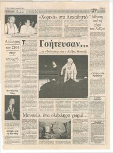Alexis Minotis: "Our society is... income oriented". Shots agianst S.E.H. and the National Theatre. He refuses to cooperate with a state stage again