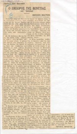 "Ο έμπορος της Βενετίας" του Σαίξπηρ, Εθνικόν Θέατρον