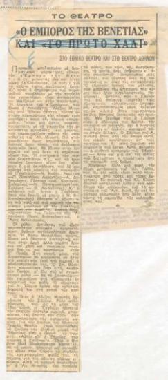 Demain première représentation du "Merchant de Venise" au Théâtre National. Alexis Minotis (Saylock) et Vasso Manolidou (Portia) parlent de leurs roles
