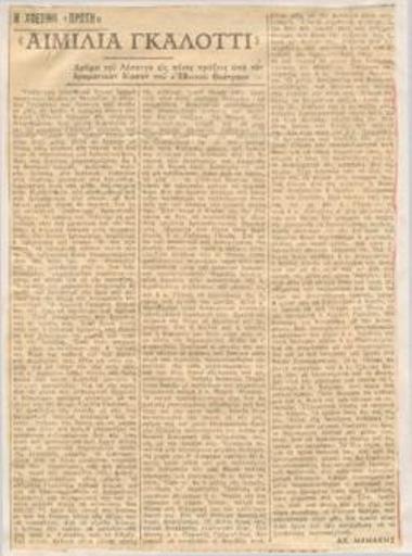 "Αιμιλία Γκαλόττι", δράμα του Λέσσιγκ εις πέντε πράξεις από τον δραματικόν θίασον του Εθνικού Θεάτρου. Η χθεσινή "πρώτη"