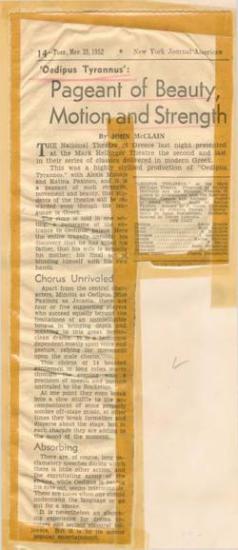 First night at the theatre. "Oedipus Tyrannus" is second bill put on by Greek National Theatre