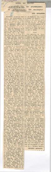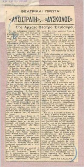 Αριστοφάνους "Λυσιστράτη", Μενάνδρου "Δύσκολος". Εθνικόν Θέατρον (Επίδαυρος)