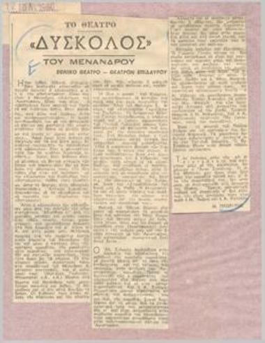 Αι παραστάσεις της Επιδαύρου. Η πρώτη διδασκαλία του "Δύσκολου" εμπρός στο ελληνικόν κοινόν της εποχής μας. Ένα πρόβλημα: Τι είναι ο Μένανδρος σήμερα;