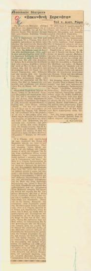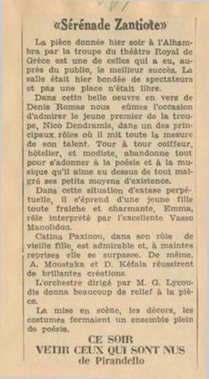 Στο Βασιλικόν. Η πρεμιέρα της "Ζακυνθινής Σερενάτας", έργον του κ. Δ. Ρώμα, σκηνοθεσία Μουζενίδη