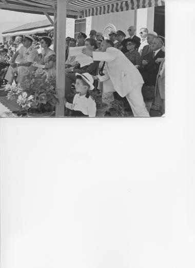 Bruce Lansdale speaking to Prince Constantine, King Paul and Queen Frederika of Greece in the background, 1954