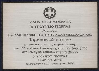 Απονομή τιμητικής διάκρισης στην Α.Γ.Σ. από τον Υπουργό Γεωργίας Γεώργιο Δρυ για τη συμπλήρωση 100 χρόνων λειτουργίας και προσφοράς στη γεωργική εκπαίδευση της Ελλάδας, 29 Ιαν. 2004