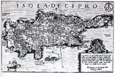 Isola de Cipro. Questa e la uera descriptione et geographia de tuta lisula de Cypre ridutta alla uera forma secundo li moderni et nomi antiqui tratta dal uero sito de essa insula con monti paludi piani ouer mesaree et casali sui et cita di. Stampata in Venetia per Matheo pagano 1538 (EL)