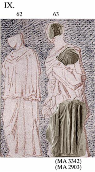 It is only in Carrey’s drawing that corner block IX is preserved. A few fragments remain in the Acropolis Museum. Two female figures (62 and 63), preserved in fragments, are shown clad in thick peplos. These end the group.