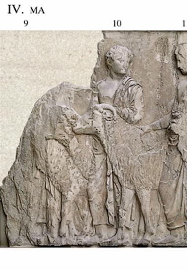 On block IV three small youths (9-11) wearing himatia are leading four rams, three of which are clearly visible. Drapery folds of the lower part of the himation of the first figure (9) remain in the left corner of the block. A second youth (10), his stance 3/4 toward the viewer, turns his head around toward the third youth (11). Each rests a hand on the animal he drives, which E. Simon believes are designated for Pandrosos.