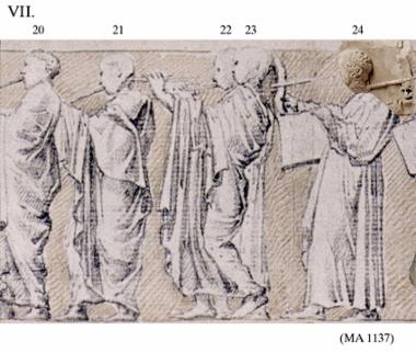 Now comes the procession of flute-players (20-23) and cithara-players(24-27). The blocks are preserved in fragments, partially. Fragments preserving heads show that these are young men with curly hair held with a hair-band. They wear long chitons with sleeves and himatia. All are facing in the direction of the procession (to the left) except for figure (26) who stands frontally and plays his cithara, thus breaking the monotony of the onward course. The two first flutists (20 and 21) walk one behind the other, whereas the second two (22 and 23) walk side by side. Variety and contrast characterise the clothing: fine crinkly folds to render linen cloth are in sharp contrast to the wide and occasionally cylindrical folds of the woolen himatia.