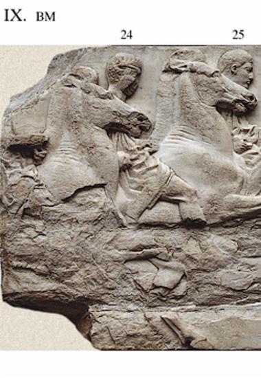 The good condition of the upper part of the block has preserved riders (24 and 25) clearly. They are clad in chlamys, evidently over short chiton, and felt boots. Just as a space has been left between the first and second groups of horsemen, here too the space between riders (25) and (26) on the next block X shows that rider (26) belongs to the next group, the fifth. Notable is the rendering of the horses’ manes as a compact mass; details of the hair will have been painted.