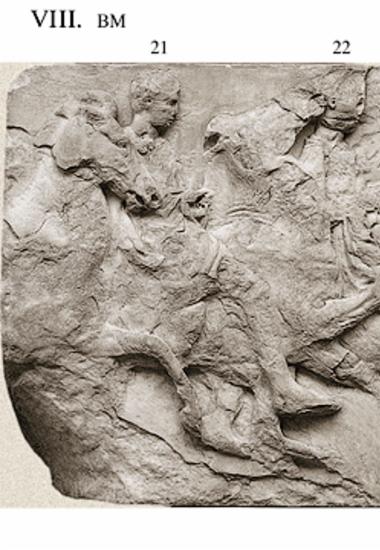 Despite severe damage, it is clear that the horsemen (21 and 22) are each wearing a chlamys over a short chiton and that they are shod in felt boots. The body of figure (23) on the right end of the block has been almost obliterated. His hands, holding the reins, are on the next block IX.