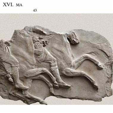 The entire top of the block is missing and with it the greater part of the heads of the two horses and the upper parts of the bodies of horsemen (42 and 43) of the seventh group. At the right of the block is a negligible gap, which has been variously interpreted as marking a separation between two groups of horsemen or as signifying two different workshops. Others have suggested that a block is missing here, an interpretation that does not stand as there is not enough room.
