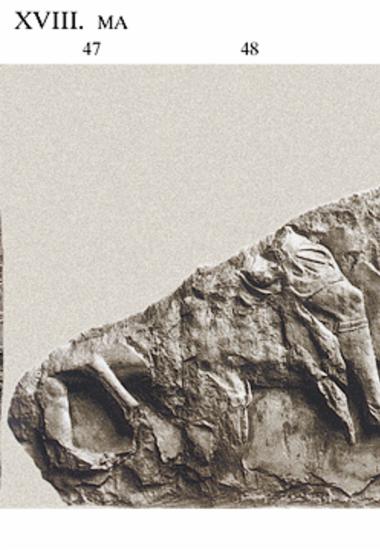 This block preserves what appears to be the lower parts of three horses’ legs, the right leg of horseman (48) showing part of his chiton over his knee, and a completely broken part of the horseman (49) who is the leader of the eighth group and spreads over onto the adjoining block XIX.